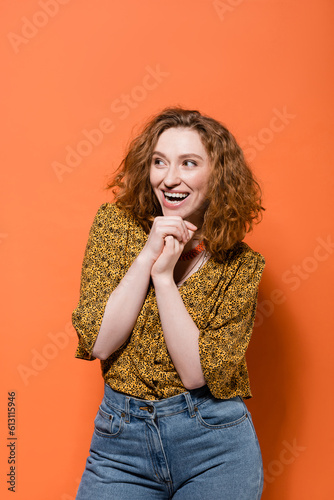 Positive young red haired woman in trendy yellow blouse with abstract pattern and jeans looking away while standing on orange background, stylish casual outfit and summer vibes concept, Youth Culture