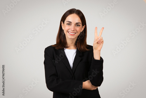 Positive young woman in a professional black suit jacket gestures peace sign with a friendly smile