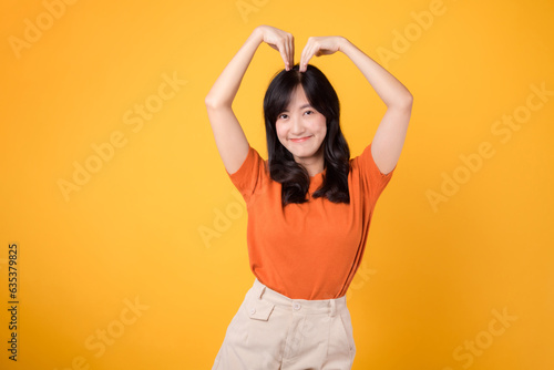 Positivity and connection come alive through an Asian woman's heartfelt smile, forming a heart with her arms, symbolizing love and happiness.
