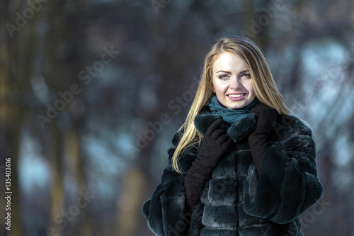 Pportrait of young attractive blonde girl smiling in winter park