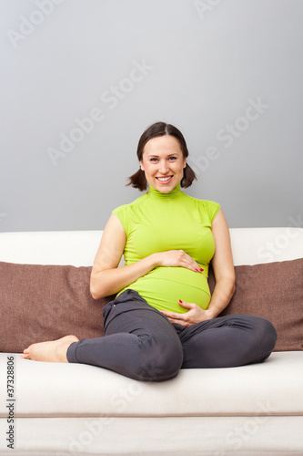 pregnant woman sitting on sofa at home