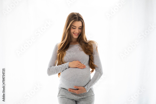 Pregnant woman smiling and touching belly on white background