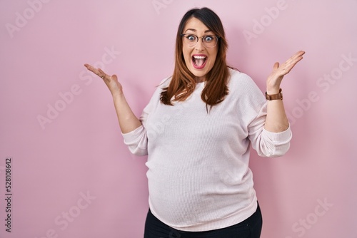 Pregnant woman standing over pink background celebrating crazy and amazed for success with arms raised and open eyes screaming excited. winner concept