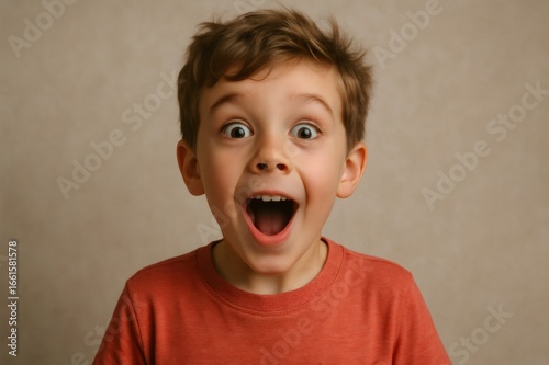 Preschool boy with mouth wide open, expressing amazement and excitement, radiating joy and surprise in a cheerful studio portrait