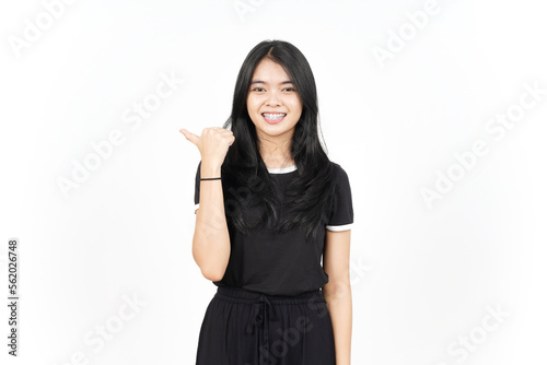 Presenting and Pointing Left Side Product Using Thumb Of Beautiful Asian Woman Isolated On White