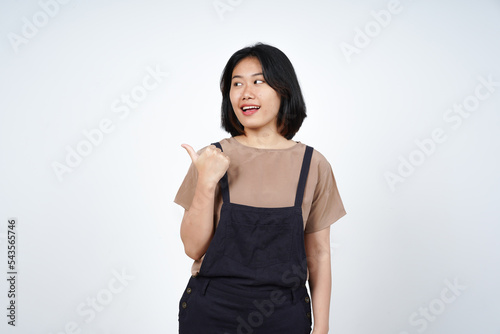 Presenting and Pointing Side Product Using Thumb of Beautiful Asian Woman Isolated On White