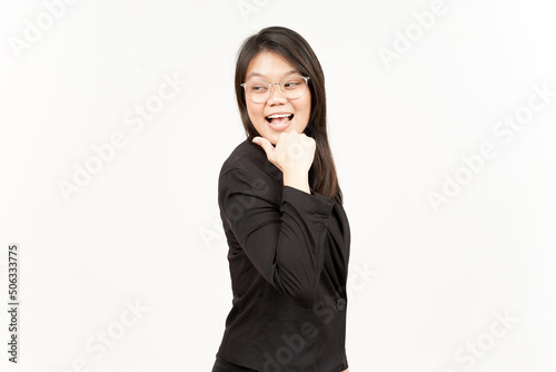 Presenting and Pointing Side Product Using Thumb Of Beautiful Asian Woman Wearing Black Blazer