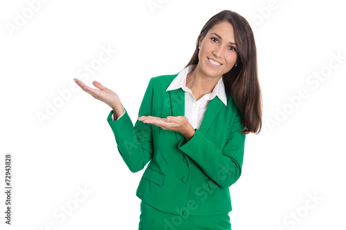 Presenting isolated businesswoman in green suit presenting new p
