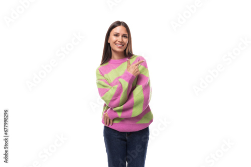 pretty 35 year old feminine model woman dressed in casual sweater on white background