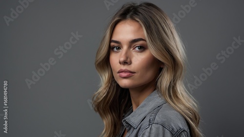 Pretty American woman in plain gray background, side view and wears casual outfit