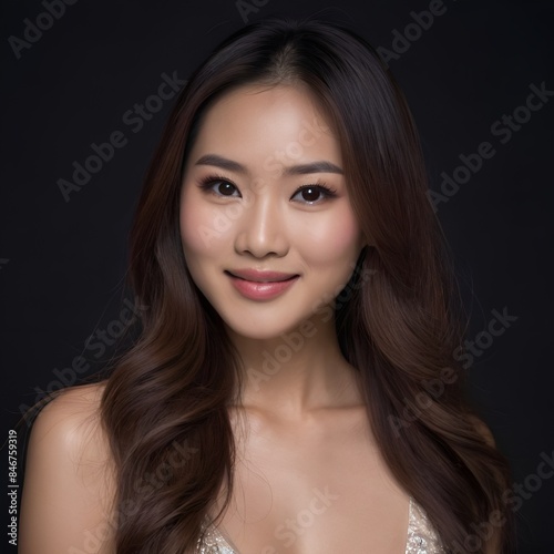 Pretty Asian beauty woman long hair with japanese makeup glowing face and healthy facial skin portrait smile on isolated black background