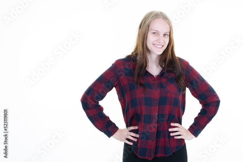 pretty beautiful young blonde woman hands on hips looking at the camera smiling blond girl isolated on white background