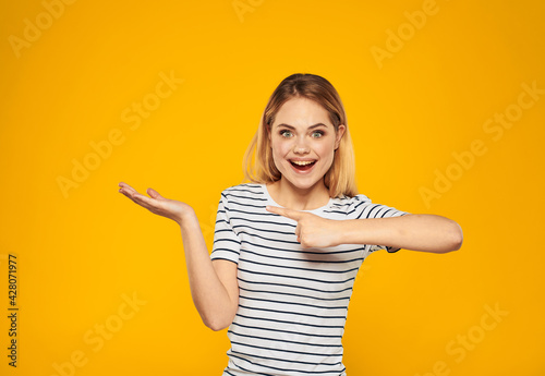Pretty blonde on a yellow background shows her hand towards emotions positive gesture smile model