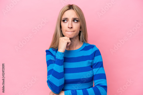Pretty blonde woman isolated on pink background having doubts and thinking