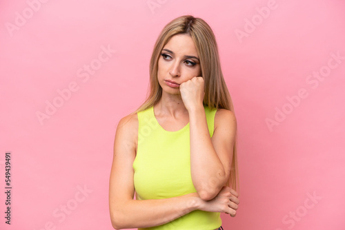 Pretty blonde woman isolated on pink background with tired and bored expression