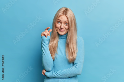 Pretty blonde woman shapes small invisible item with fingers demonstrates small amount of something talks about her little achievement dressed in casual turtleneck isolated over blue background