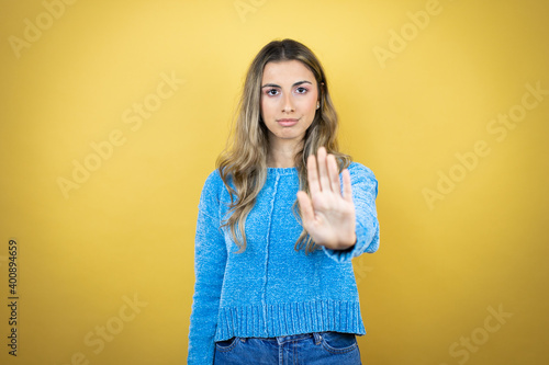 Pretty blonde woman with long hair standing over yellow background serious and doing stop sing with palm of the hand.