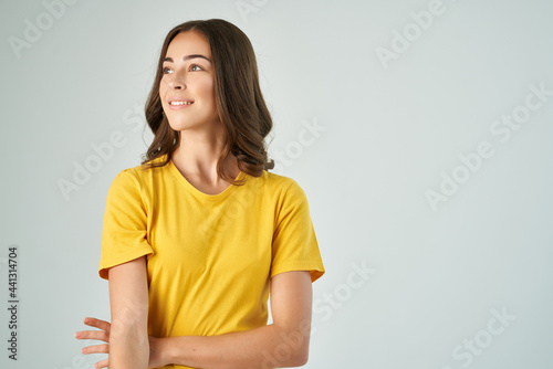 pretty brunette in yellow t-shirt smile posing lifestyle