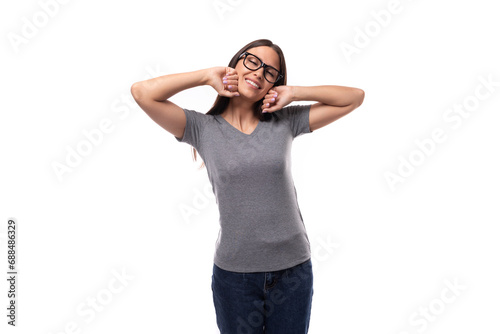 pretty brunette leader woman dressed in gray t-shirt with fabric print mockup