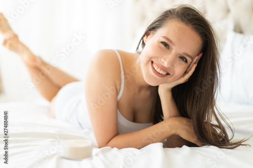 Pretty Caucasian woman applying cosmetic cream on her face and looking at camera.