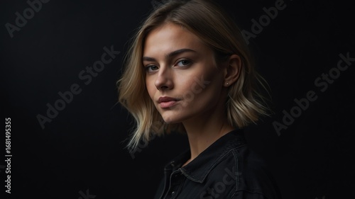 Pretty Caucasian woman in plain black background, side view and wears casual outfit