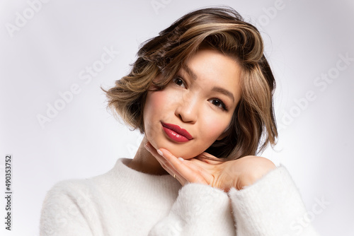Pretty cute young asian woman with stylish short hair, perfect modern makeup, smooth skin on white studio background, headshot portrait. Make-up cosmetics, hairstyling products advertising.