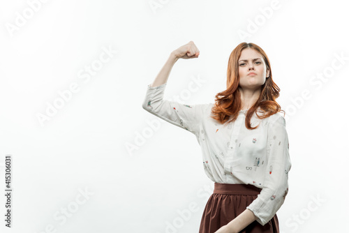 pretty emotional woman gesturing with her hands in formal suit cropped view studio