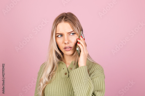 Pretty european woman in casual knitted sweater on pink background isolated hold phone having conversation with curious confused serious face