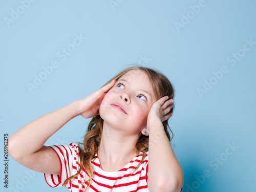 pretty girl with curly hair and red white striped shirt is posing in front of blue background and is happy