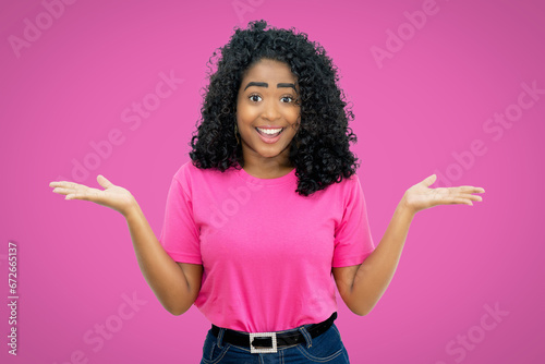 Pretty mexican young adult woman on pink background