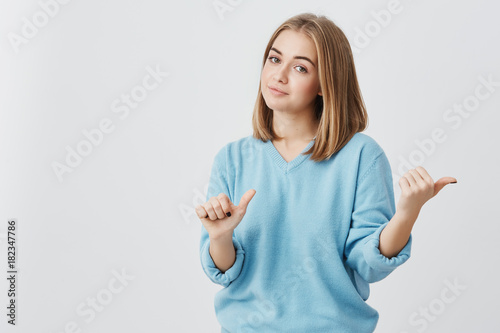 Pretty pleasant-looking female with fair hair, pointing with her thumbs sidewards, showing copy space for advertising content. Good-looking beautiful girl in blue sweater isolated on studio wall.