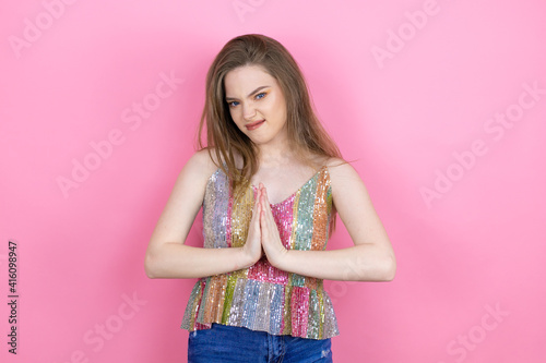 Pretty redhead woman wearing a shiny top standing over pink background begging and praying with hands together with hope expression on face very emotional and worried