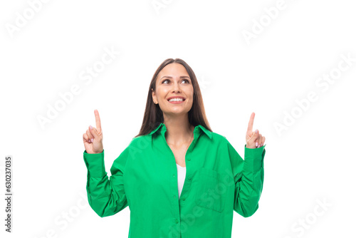 pretty slender european brunette woman with long hair and brown eyes dressed in a casual green shirt looks at the empty space from above