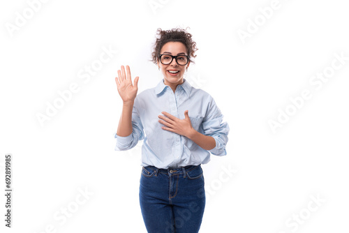 pretty slender young brunette curly employee of the company woman dressed in a light blue shirt and jeans