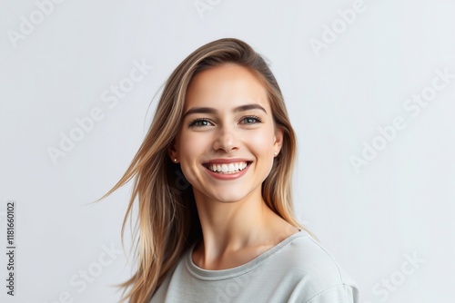 Pretty smiling joyfully female with fair hair, dressed casually, looking with satisfaction at camera, being happy. Studio shot of good-looking beautiful woman isolated against blank studio wall.