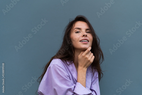 Pretty stylish woman in purple shirt posing on blue wall background, long dark beautiful hair, natural makeup, soft skin