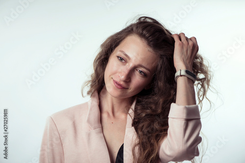 pretty stylish young girl model with long curly hair in a jacket on a white background