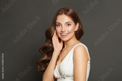 Pretty surprised woman with perfect clean skin, natural makeup and long healthy brown curly hair on gray studio background