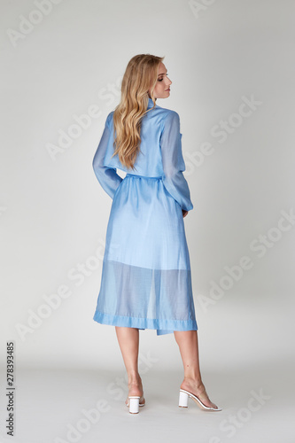 Pretty woman beautiful face bright makeup long blond hair fashion model wear trend clothes for date party summer walk travel cruise collection organic silk cotton dress accessory jewelry white studio.
