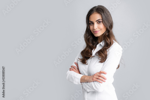 Pretty woman dressed casually in shirt looking with satisfaction. Studio shot of beautiful woman isolated against gray background.