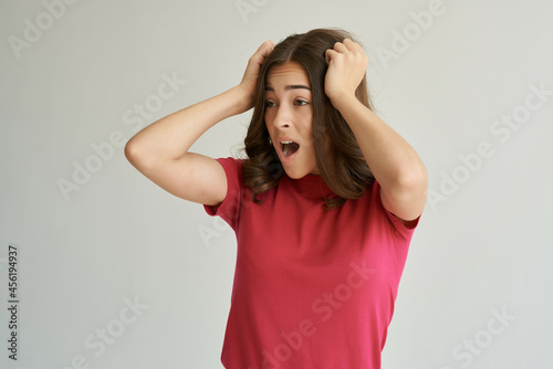pretty woman in a red t-shirt hair care Studio Lifestyle