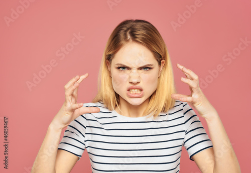 pretty woman in a striped T-shirt discontent upset studio isolated background