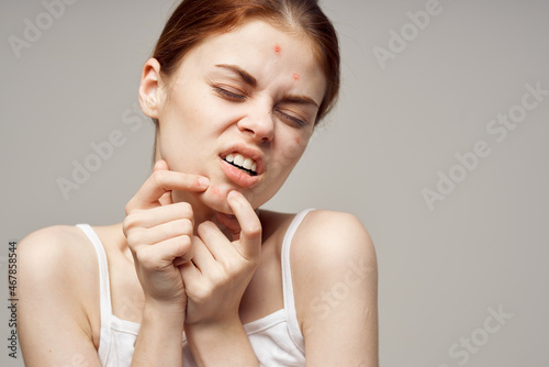pretty woman in a white t-shirt pimples on the face close-up