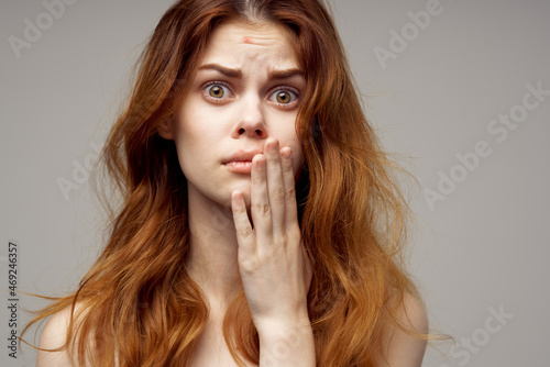 pretty woman in a white t-shirt pimples on the face close-up