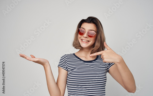pretty woman in fashion clothes red skirt striped t-shirt sunglasses gesturing with hands