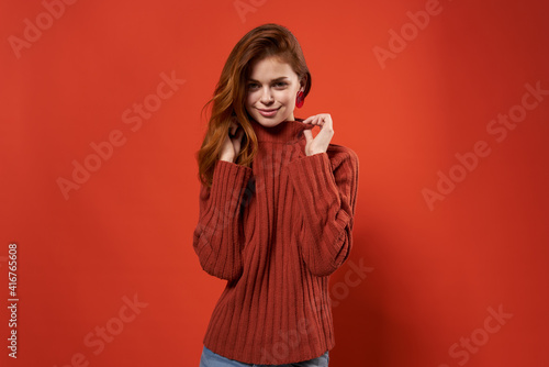 pretty woman in red sweater decoration fashion hairstyle glamor red background