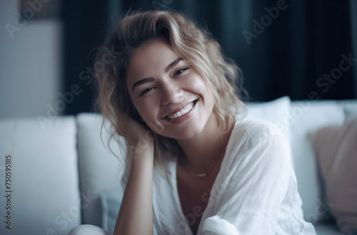 pretty woman smiling happy on the sofa at home wearing a white robe, ai generative