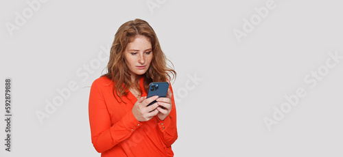 Pretty young adult woman holding smartphone on white studio wall banner background