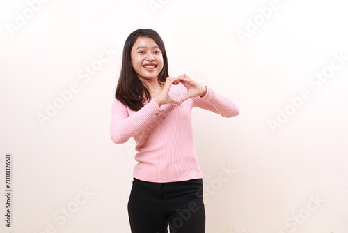 Pretty young asian girl standing while making love shape hand. Isolated on white background