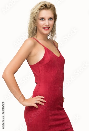 pretty young blonde woman with a red dress on white